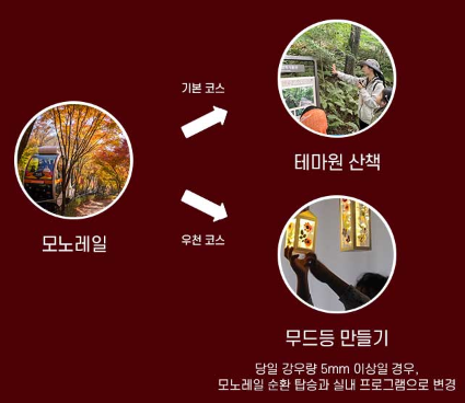 프로그램 : 화담숲 소개 - 모노레일탑승(1~2승강장) - 테마원 산책(양치식물원 ~ 야외학습장(휴식) ~ 원앙연못) - 마무리